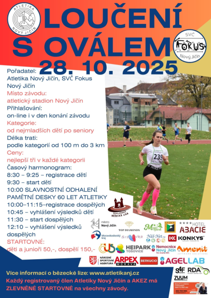 V podzimní čas nás budet čekat 4. ročník závodu Loučení s oválem. Závod se uskuteční v den státního svátku, v sobotu 28. 10. na atletickém stadionu v Novém Jičíně. Můžeme porovnat výsledky s Jarním oválem, který se uskutečnil na začátku sezóny. Datum konání: 28. 10. 2025 Lokalita: Nový Jičín Místo konání: Atletický stadion Povrch: tartan Typ závodu: děti a dospělí Délka: 100m, 200m, 400m, 800m, 3km STARTOVNÉ: děti a junioři 50,- Kč (členové Atletiky Nový Jičín a Atletiky SVČ Fokus 20,- Kč) dospělí 150,- Kč (členové AKEZ Kopřivnice 100,- Kč) ČASOVÝ HARMONOGRAM: 8:30 – 9:25 – registrace dětí 9:30 – start dětí 10:00 – 11:15 – registrace dospělých 10:45 – vyhlášení výsledků dětí 11:30 – start dospělých 12:10 – vyhlášení výsledků dospělých KATEGORIE DĚTÍ: holky 2022 a mladší s rodiči – 100 m kluci 2022 a mladší s rodiči – 100 m dívky 2020/21 – 100 m chlapci 2020/21 – 100 m dívky 2018/19 – 200 m chlapci 2018/19 – 200 m mladší přípravka dívky 2016/17 – 400 m mladší přípravka chlapci 2016/17 – 400 m starší přípravka dívky 2014/15 – 400 m starší přípravka chlapci 2014/15 – 400 m mladší žačky 2012/13 – 800 m mladší žáci 2012/13 – 800 m starší žačky 2010/11 – 800 m starší žáci 2010/11 – 800 m juniorky 2007/09 – 800 m junioři 2007/09 – 800 m KATEGORIE DOSPĚLÍ: muži A (1986 a mladší) – 3 km muži B (1976 – 1985) – 3 km muži C (1966 – 1975) – 3 km muži D (1956 – 1965) – 3 km muži E (1955 a starší) – 3 km ženy F (1986 a mladší) – 3 km ženy G (1976 – 1985) – 3 km ženy H (1975 a starší) – 3 km